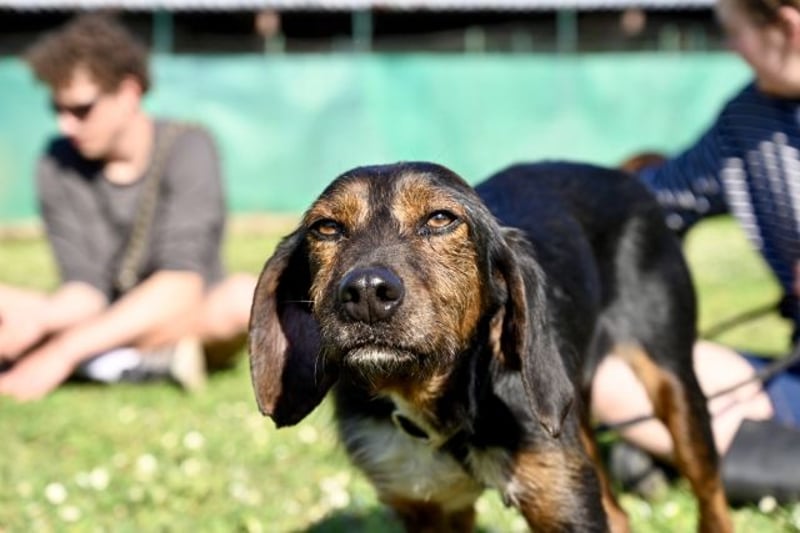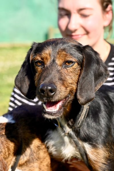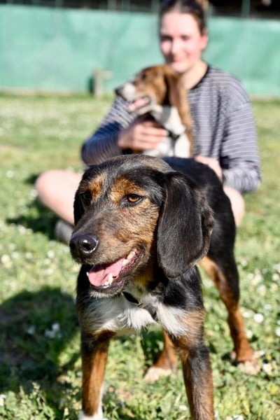 Optisch trägt sie ein dunkles, schwarz-braunes Fell mit warmen Abzeichen. Ihr sanfter Blick und die langen, weichen Ohren verleihen ihr diese besondere, elegante Ausstrahlung. Ihre Schwester Mia ist heller, braun-weiß gezeichnet, mit einem weichen Ausdruck – und meist ganz in ihrer Nähe.
