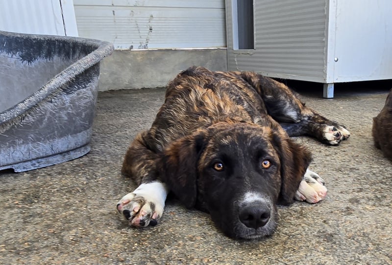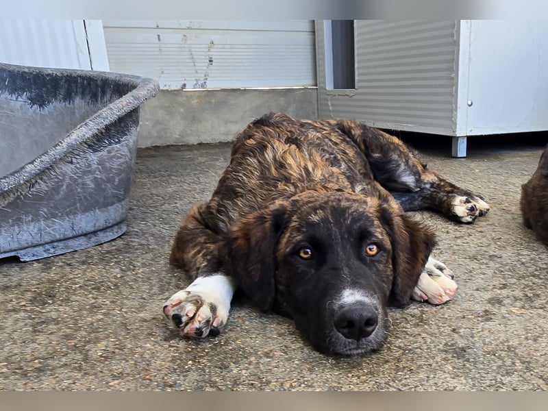 Marronicino ist ein echter Hingucker. Er ist kein Draufgänger, verhält sich eher devot im Rudel, drängt sich nicht vor und wartet bis er an der Reihe ist. Wenn er jemanden mit seinen großen dunklen Augen anschaut, spürt man seine Sehnsucht nach Geborgenheit und Liebe. Wie gerne würde er kuscheln und streicheln, aber bei dem Gewusel der anderen Welpen (insgesamt 8) verlässt ihn der Mut. Als wir ihn rausholten, drückte er sich an uns und wollte nicht mehr zurück.