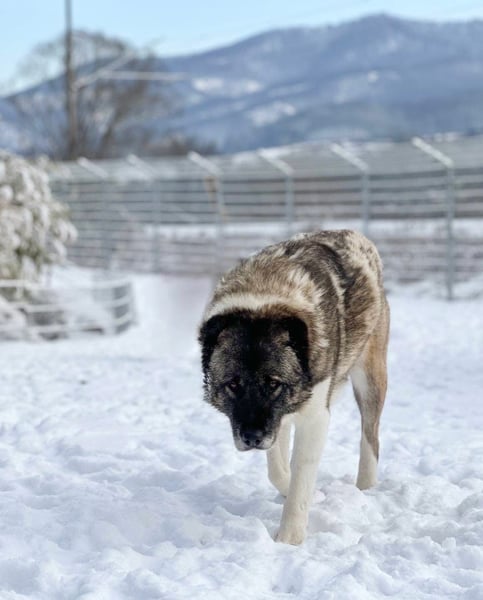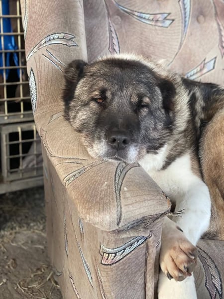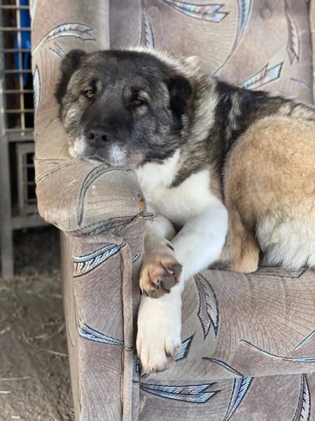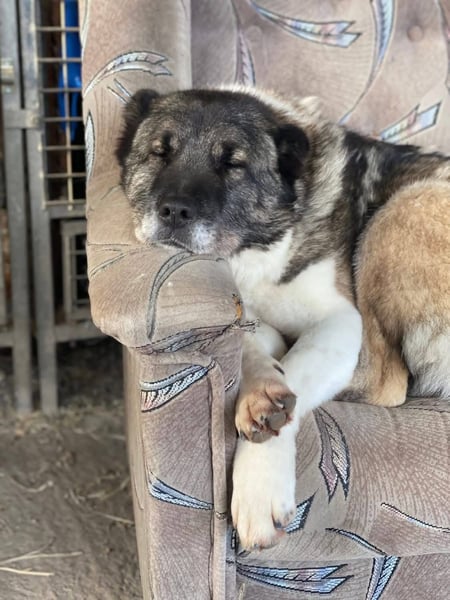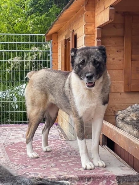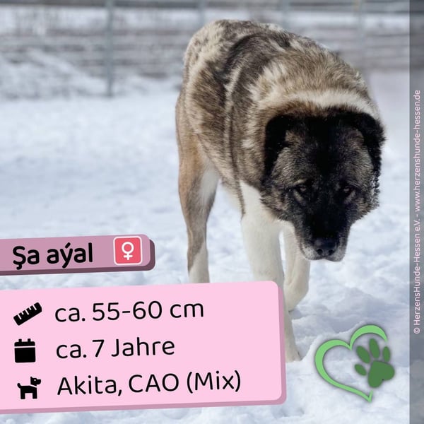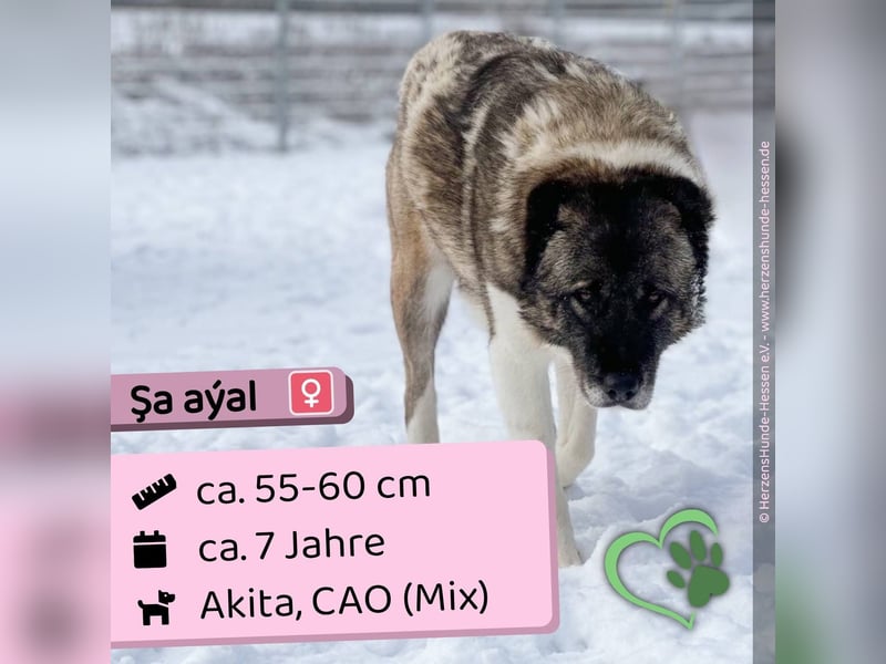Şa aýal ist eine etwa 7 Jahre alte, kastrierte Zentralasiatische Owtscharka-Hündin (Alabai), wobei wir vermuten, dass auch ein Akita zu ihren Ahnen zählt. Mit etwa 40 kg ist sie etwas kleiner und zierlicher als viele ihrer reinrassigen Artgenossen, bringt aber dennoch die typische Präsenz ihrer Rasse mit.