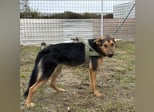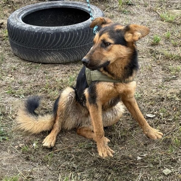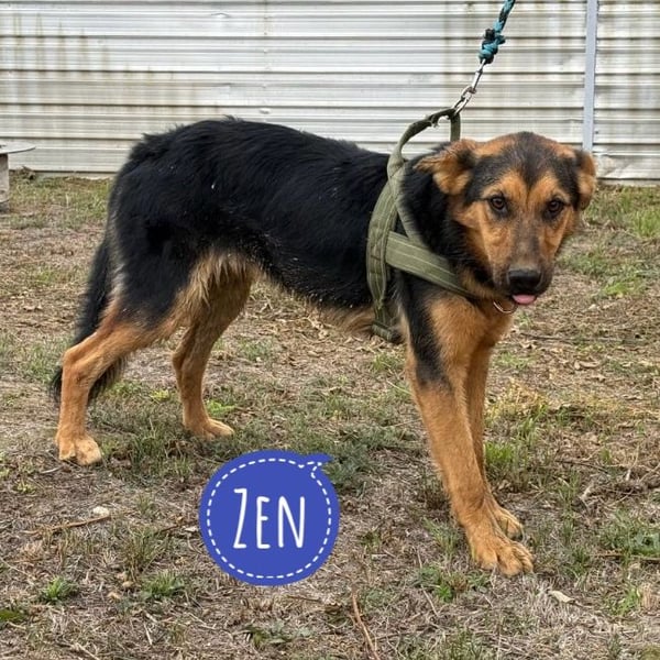 Zen ist ein Bub, er ist laut Tierarztschätzung ca. 1 Jahr alt (geb. 01.09.2024), wiegt 17 kg und ist ca. 50-55 cm groß. Vermutet wird ein Schäferhund - Bracke Mischling.