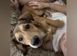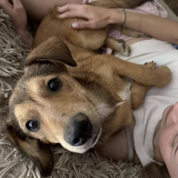 Jere ist ein Bub, laut Tierarztschätzung ca. 1 Jahr alt (geb. 11.11.2024), etwa 45 cm groß und wiegt 17 kg. Vermutet wird ein Dachsbracke Mischling.