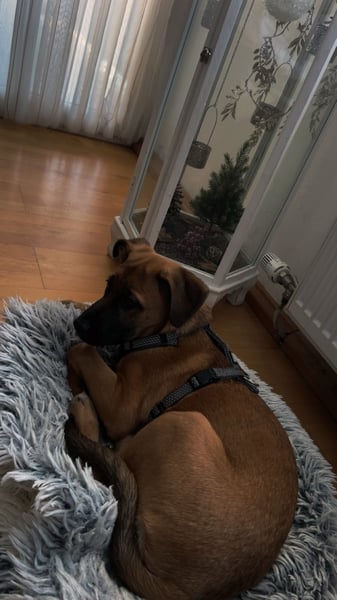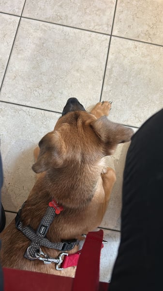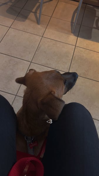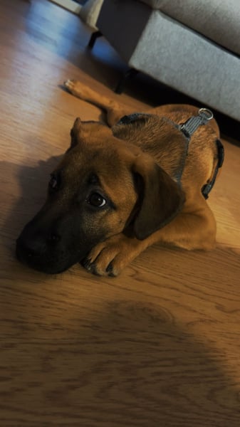 An der Leine laufen kann ich auch aber auch ohne, da ich mich immer wieder umschaue damit ich meinen Menschen nicht verliere + gut auf meinen Namen höre. Wir sind auch gerade dabei das Kommando "hier" zu lernen, das funktioniert schon gut aber ist noch ausbaufähig sowie Sitz und Platz zb.