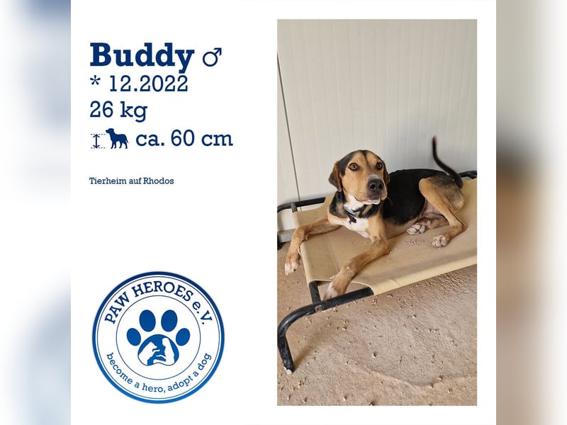 Buddy ist ca. 2 Jahre alt, 60 cm hoch und kastriert. Er ist ein aktiver und lebhafter Hund, der viel Energie hat und gerne die Welt erkundet.