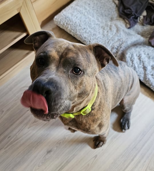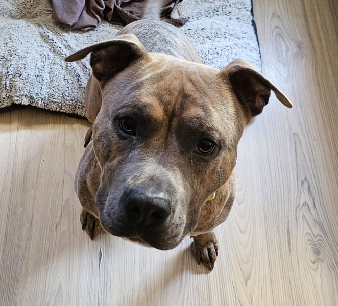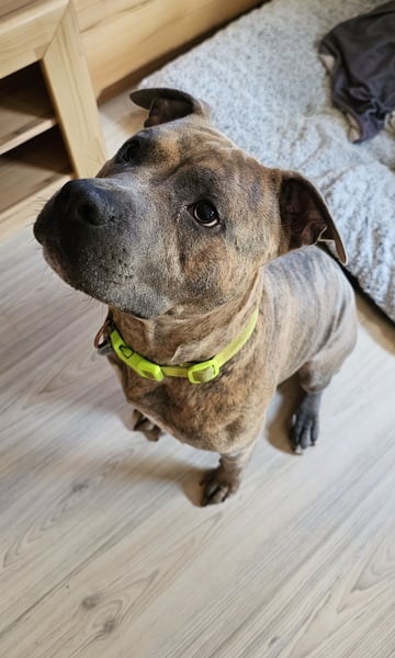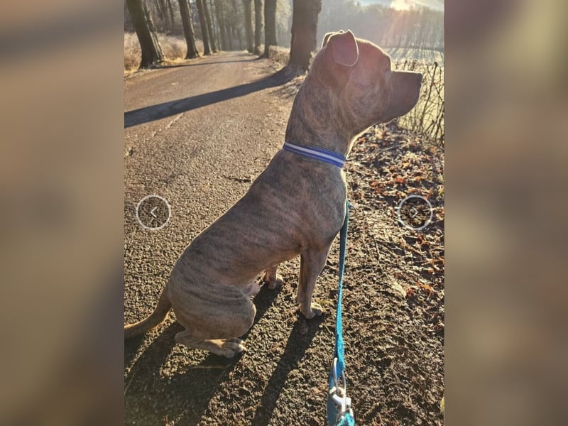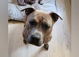 Baxx ist am 20.03.24 geboren, ist knie hoch und wiegt etwa 25kg, er ist ein American Staffordshire Terrier.