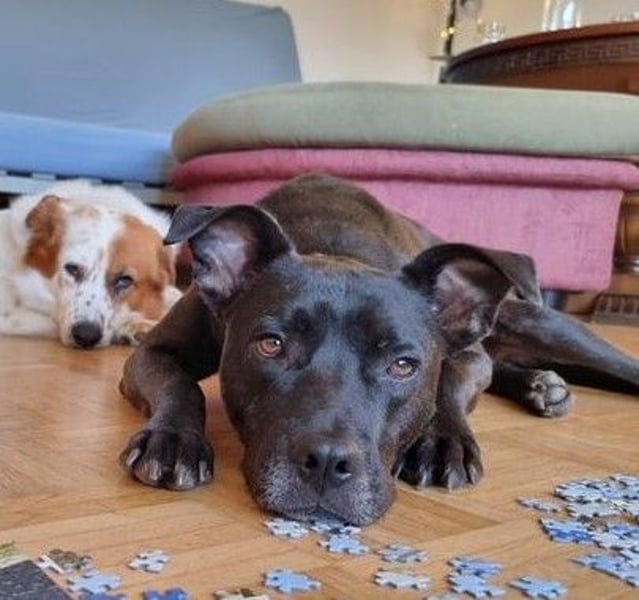Bruno ist ein zierlicher Amstaff-Mix, der im Alter von drei Monaten im rumänischen Tierheim Ari Paws aufgenommen wurde. Seit Juli 2025 lebt er auf einer Pflegestelle in Klagenfurt.
