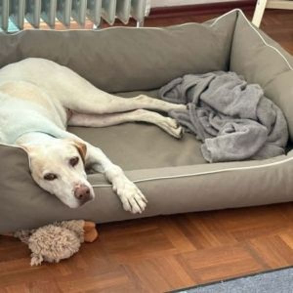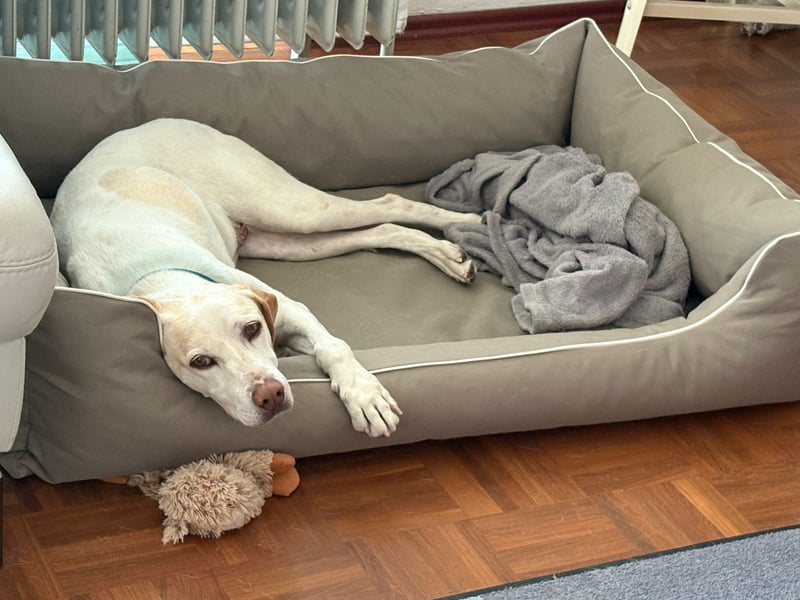 Zuhause zeigt sie sich ruhig und ausgeglichen. Sie bellt weder wenn es klingelt noch wenn sie etwas draußen hört. Nur selten entweicht ein tiefes Wuff. Manchmal braucht sie noch etwas Hilfe um eigenständig auf ihren Platz zu gehen und auszuruhen, aber mit Konsequenz klappt das dann sehr gut.