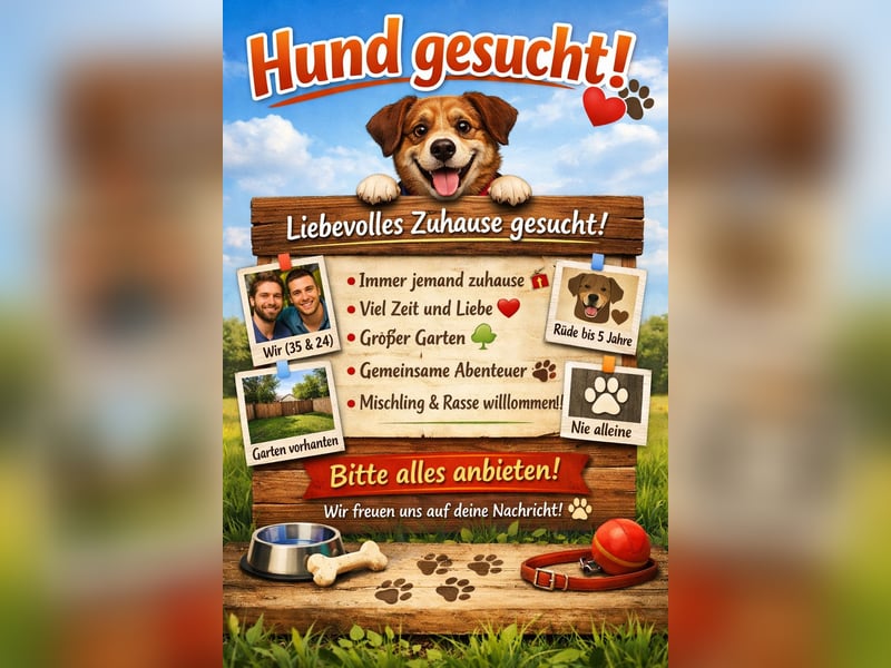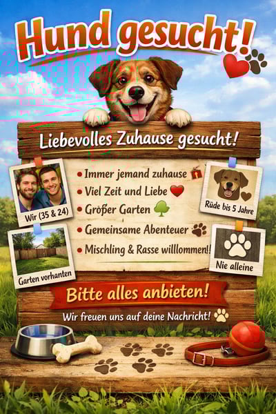 Wir sind zwei Männer (35 und 24 Jahre alt) und auf der Suche nach einem treuen vierbeinigen Begleiter.