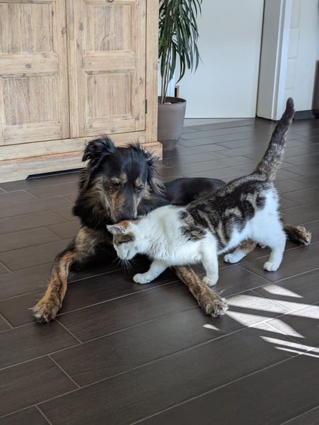 Mit den vorhandenen Katzen kuschelt er und von seinen Menschen lässt er sich ebenfalls gerne schmusen.