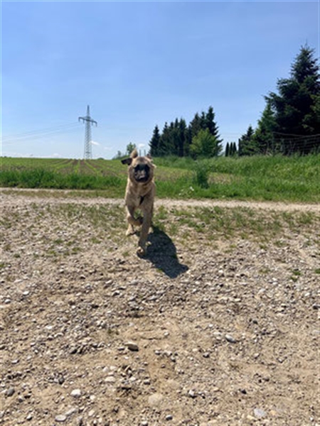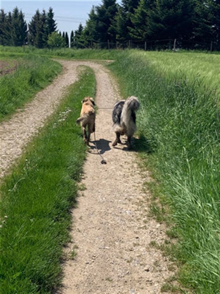 Auf Spaziergängen ist er dann Junghund – mäßig unterwegs, soll heißen, mit einiger Energie und Spaß am Leben. Er ist ein absoluter Wasserfreund und macht locker jedem Golden Retriever Konkurrenz, da er zielsicher alle (Matsch-) Pfützen findet und für ausgiebige Matschbäder nutzt. Wohl dem, der einen Wasserschlauch im Garten hat!