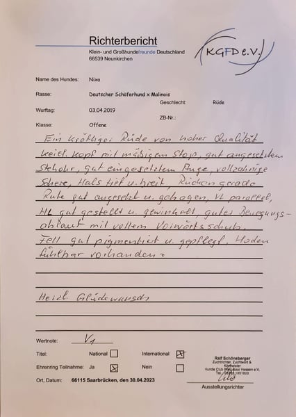 Nixa besitzt bislang keine Deckerfahrung. Bei einer passenden Hündin besteht Interesse an einem Welpen aus dem daraus resultierenden Wurf als Ausgleich (1te Wahl).