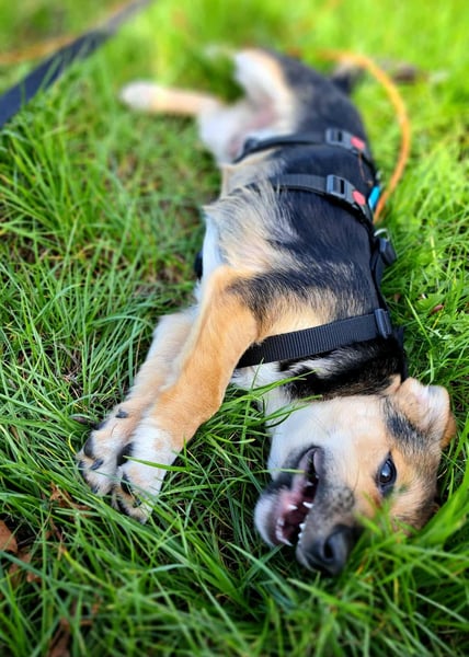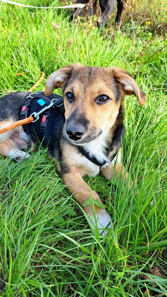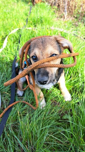 Die Stubenreinheit übt er bereits fleißig und macht seine Geschäfte überwiegend draußen. Auch das Laufen an der Leine wird momentan trainiert – er macht tolle Fortschritte und läuft draußen schon prima mit. Im Auto fährt Biscotti brav mit, kennt bereits seinen Namen und arbeitet motiviert an seinem ersten Kommando „Sitz“.