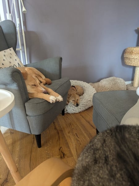 Besonders genießt Maria die Nähe zu ihren Menschen. Streicheleinheiten sind für sie das Größte, und sie kuschelt für ihr Leben gern. Auch mit anderen Tieren kommt sie wunderbar zurecht. Auf ihrer Pflegestelle lebt sie harmonisch mit drei weiteren Hunden zusammen und zeigt sich auch im Umgang mit Katzen sehr freundlich. Mit einer der Katzen wird sogar schon gemeinsam gekuschelt. Wie sie auf Kinder reagiert, können wir aktuell noch nicht sicher sagen.