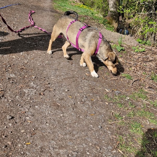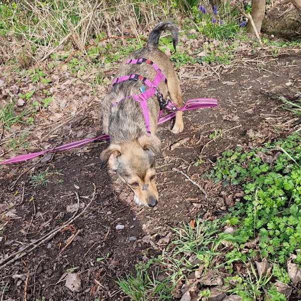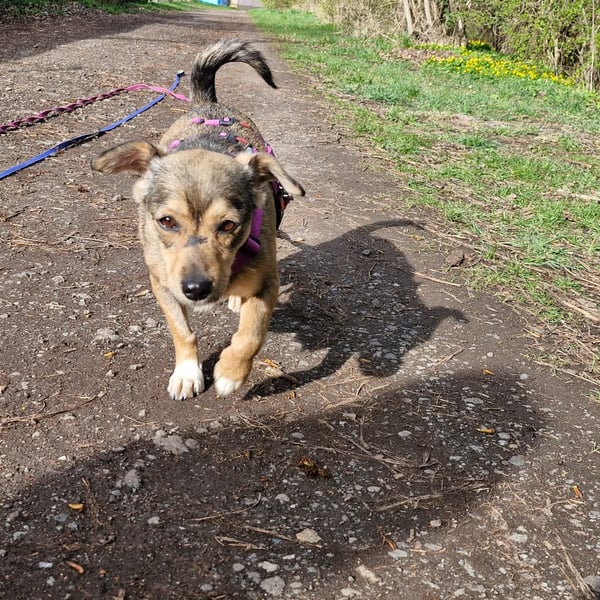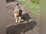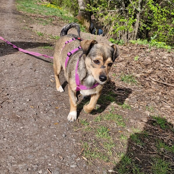 Mary läuft entspannt an der Leine und ist ein unkomplizierter Reisebegleiter im Auto. Beim Ein- und Aussteigen braucht sie noch ein bisschen Unterstützung – ein kleiner Handgriff, und schon ist sie dabei!