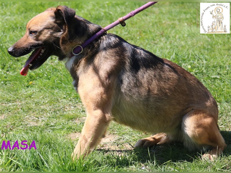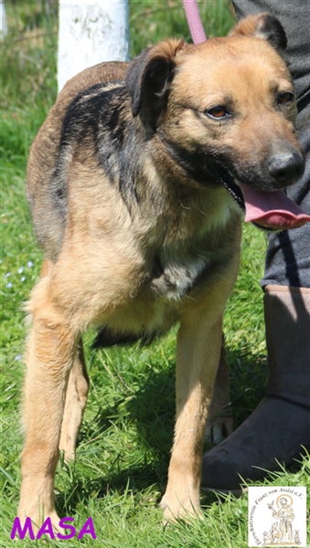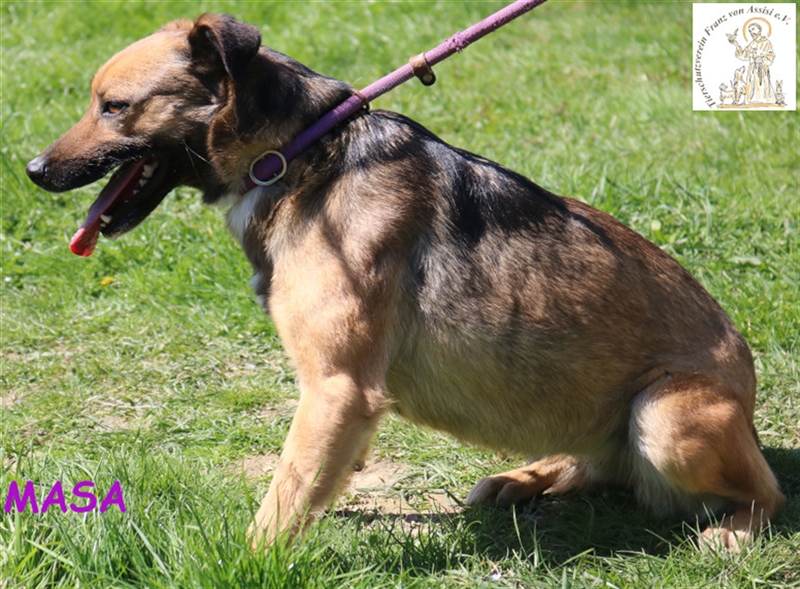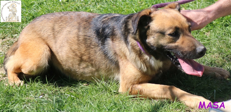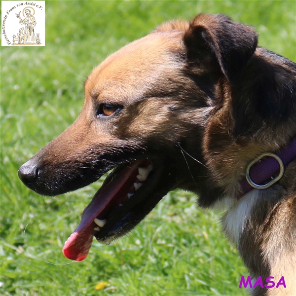 Masa ist eine etwas vorsichtige kleine Hündin. Sie wurde als Welpe mit einer Plastikflasche über dem Kopf am Straßenrand gefunden und in der Pension in Sicherheit gebracht.