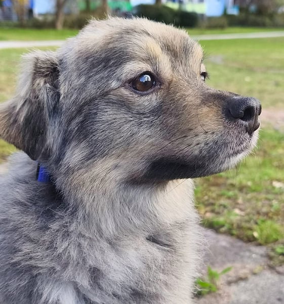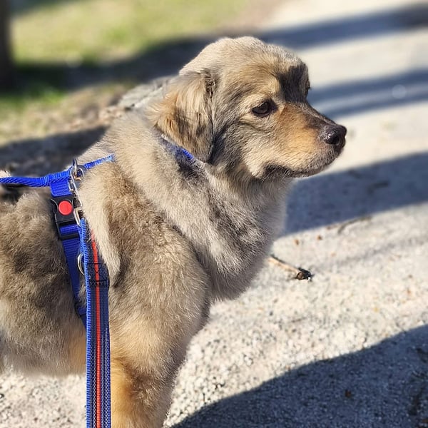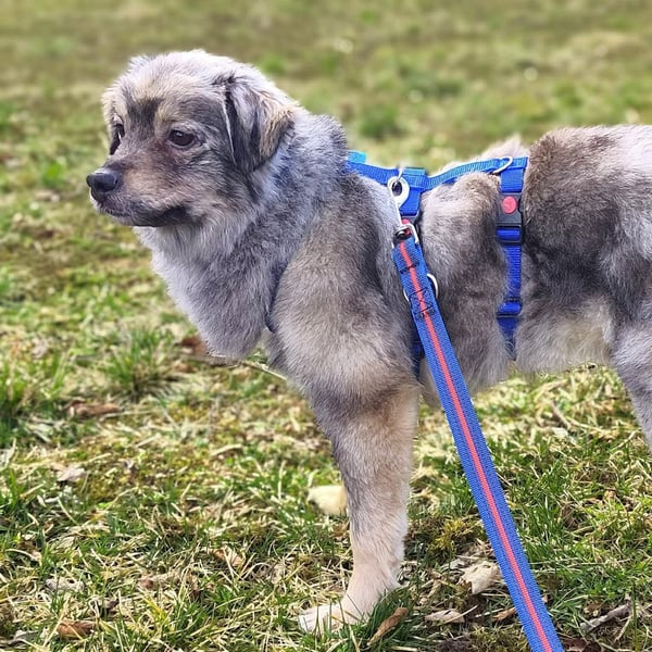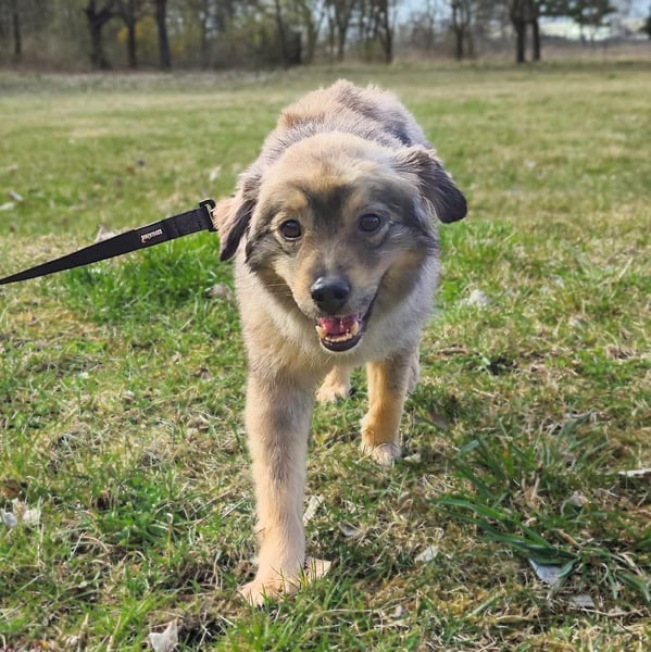 Kunibert hat bereits erste Grundkommandos erlernt, geht gut an der Leine und zeigt sich orientiert. Bei Reizen, die ihn verunsichern, benötigt er noch die Sicherheit seines Menschen, da er ansonsten flüchten möchte.