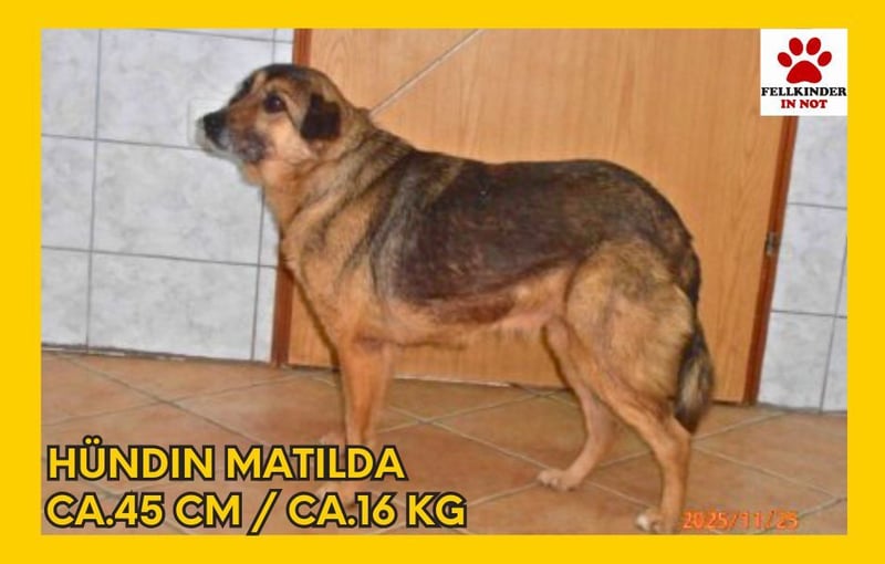 Matilda ist eine mittelgroße schon etwas ältere Mischlingshündin, vermutlich steckt ein Schäferhund Mix ihn ihr.