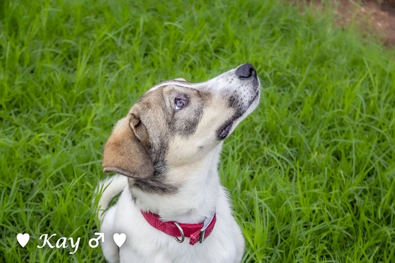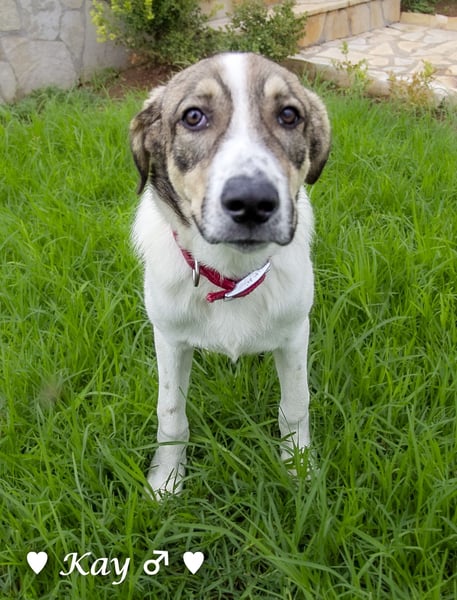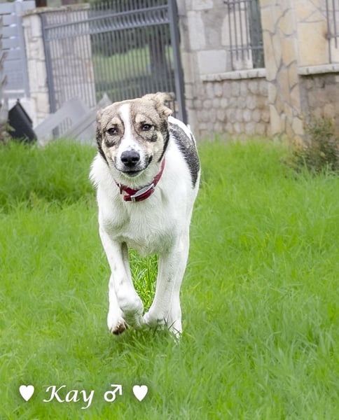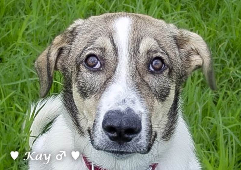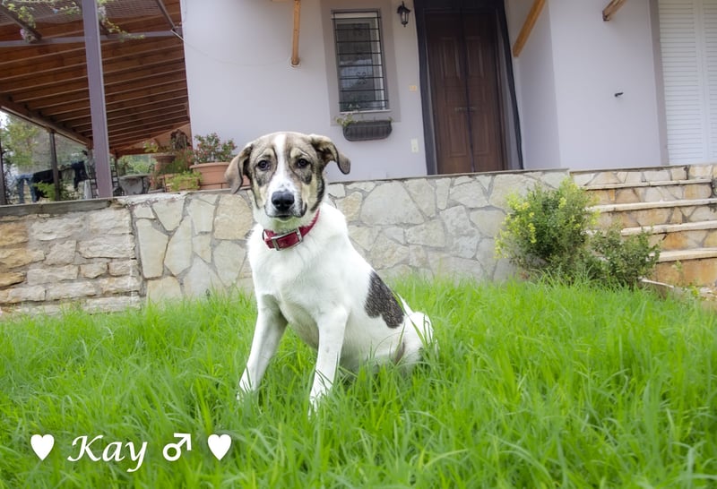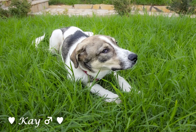 Kay ist ca. 6 Monate alt, ein fröhlicher Junghund. Er wurde an einem Baum am Shelter angebunden.