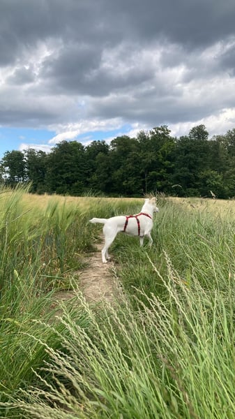 Ich kann, nach einer angemessenen Eingewöhnungsphase in meinem neuen zu Hause 4-5 Stunden gut alleine bleiben, bin stubenrein, Auto/Zug/Fahrradfahren sind mit meiner Vertrauensperson gar kein Problem, die Grundkommandos hab ich auch schon drauf und Kopfarbeit liebe ich besonders, Mantrailing und Apportieren find ich richtig cool.