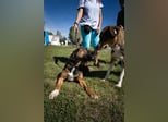 Sobald er auf der großen Wiese mit den Freiwilligen Gassi geht, läuft er entspannt an anderen Hunden vorbei , ohne dass er ihnen groß Aufmerksamkeit schenkt.