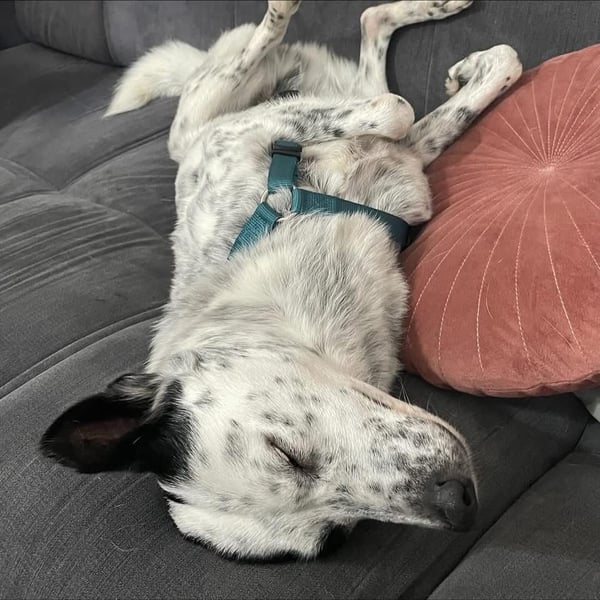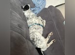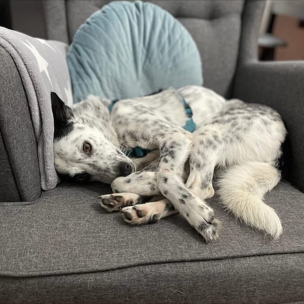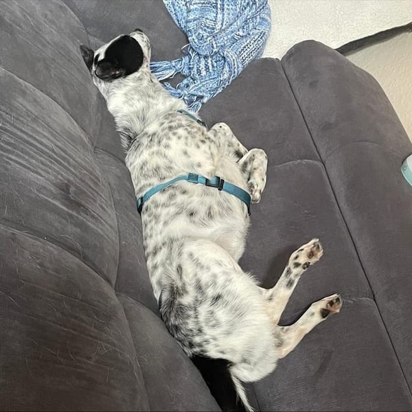Aktuell lernt Charlie fleißig seinen Namen, den Rückruf und das „Runter“-Kommando. Stubenrein ist er schon fast ganz und etwa 1,5 Stunden allein bleiben klappt problemlos.