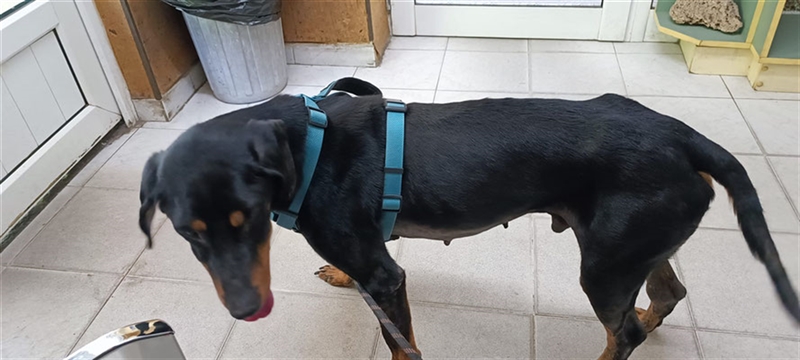 Woodie ist nicht älter als 5-6 Jahre, laut Tierarzt, aber er war völlig abgemagert, fast kahl und extrem schwach.