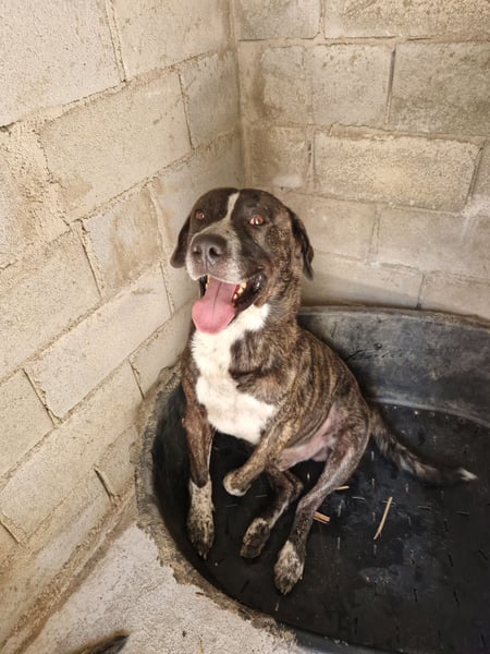 Er rennt und spielt mit den anderen Hunden und ist sehr sozial. Mit anderen Rüden verhält er sich manchmal etwas dominant. Daher würden wir ihn nicht in ein Zuhause mit vorhandenem Rüden vermitteln. Hündinnen sind kein Problem.