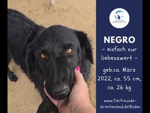 Negro ist verträglich mit anderen Hunden und kommuniziert sicher und freundlich, die Hundesprache beherrscht er im Schlaf. Menschen gegenüber ist er aufmerksam und bemüht, alles richtig zu machen. Er möchte einfach dazugehören, lernen, vertrauen und endlich ankommen.