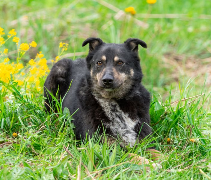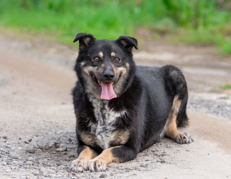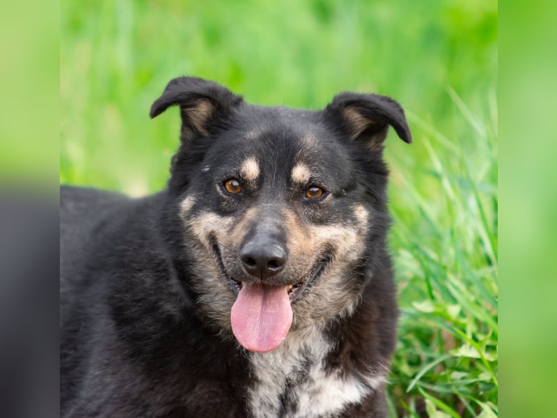 Ihr Geschichte: Mukha lebte auf einer Baustelle während eines Aufbaues eines Mehrfamilienhaus. Die Bauleute fütterten sie während der zeit und kümmerten sich so gut es ging und sie. Als die Bauarbeiten abgeschlossen waren sollte sie dort weg und so nahmen wir sie zu uns.