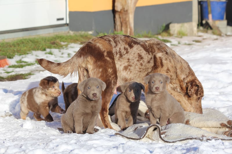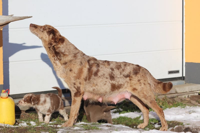 Mutter eine schoko merle Aussiedor Hündin der 3. Generation