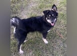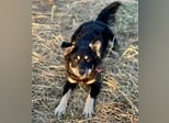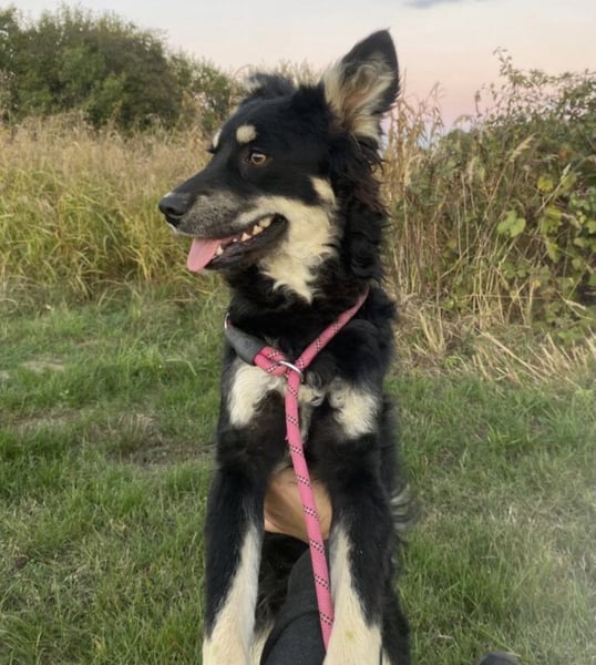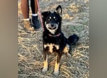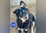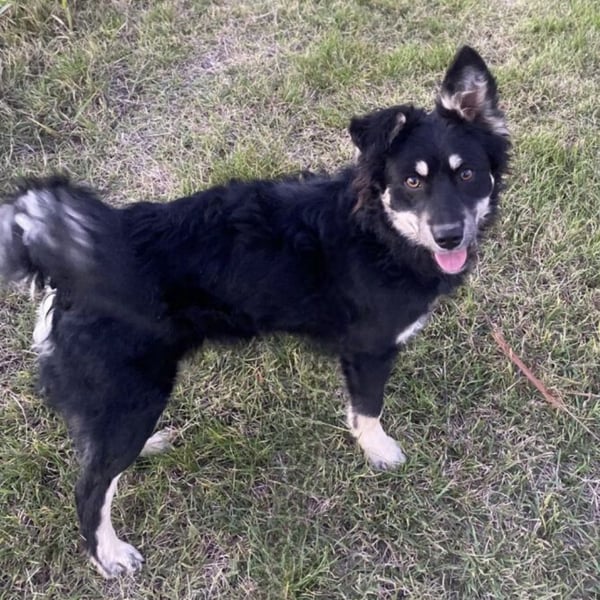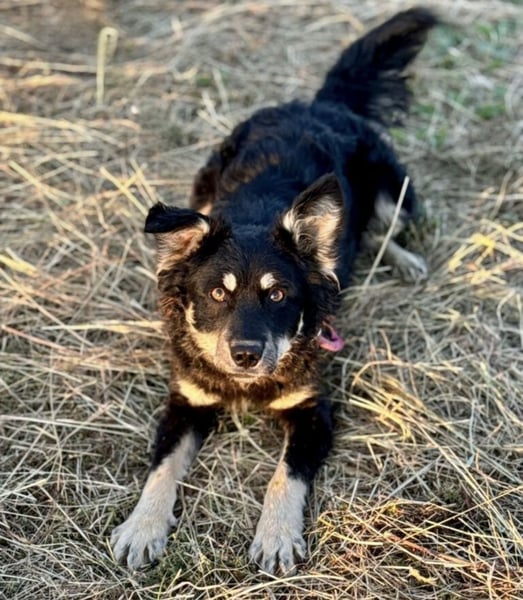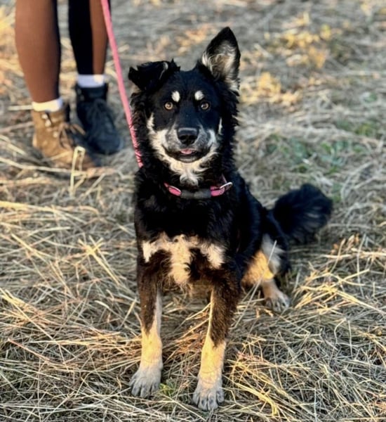 Jimbo ist laut Tierarztschätzung ca. 1 Jahr alt (geb. 12/2024), etwa 49 cm groß und wiegt rund 12,5 kg. Vermutet wird ein Australian Kelpie - Mudi Mischling.