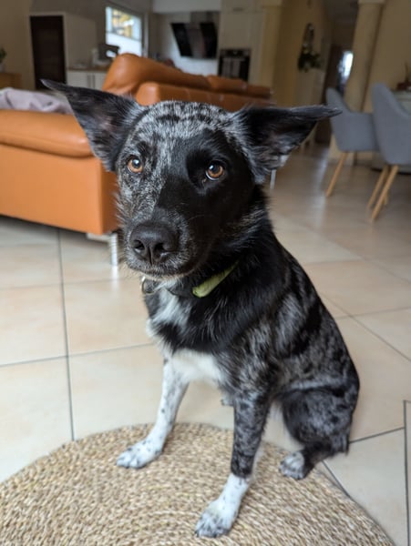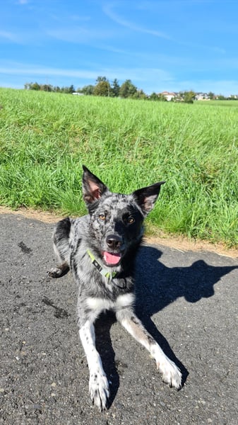 Familienfreundliche, aktive, junge Mischlingshündin Blue Merle sucht neues Zuhause