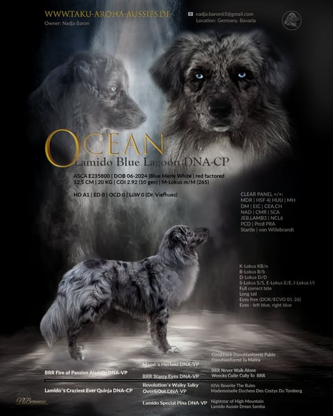 Ocean überzeugt durch einen ausgeprägten will to please, hohe Konzentration und eine klare, ruhige Arbeitsweise. Leistungsbereit und fokussiert, dabei jederzeit ansprechbar und mit sicherem Off-Switch.