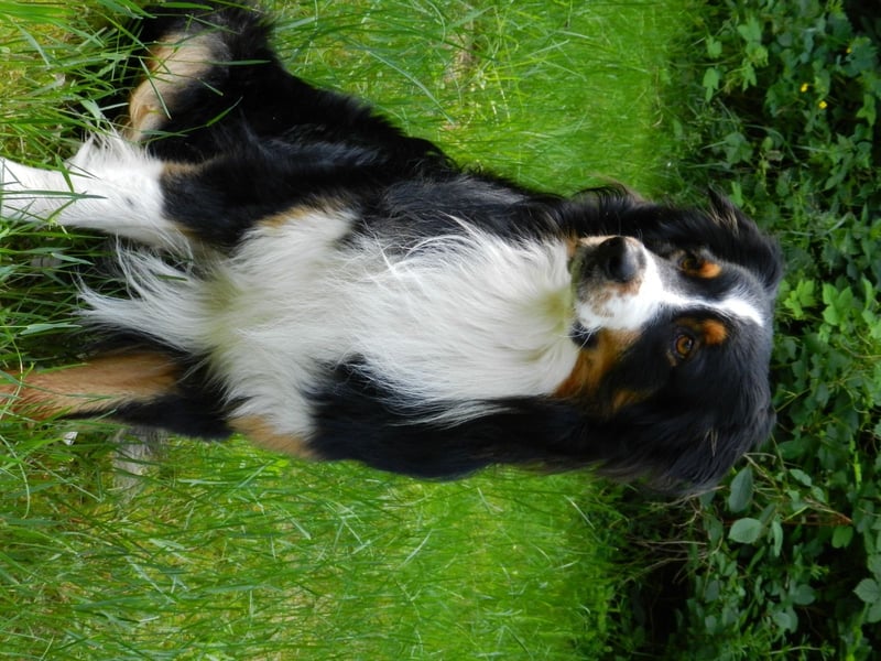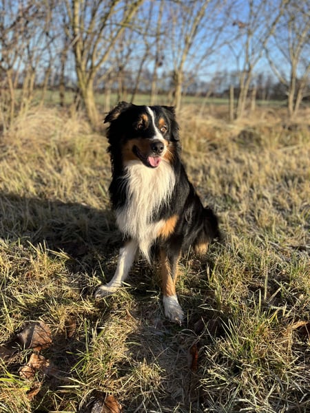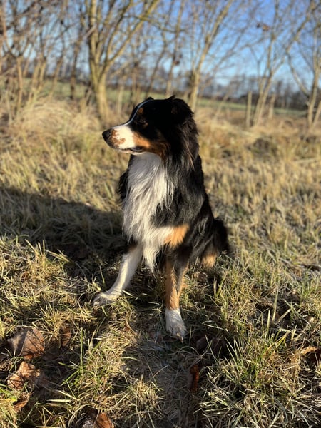 Er ist ein typischer Australian Shepherd – intelligent, bewegungsfreudig und aufmerksam. Er braucht sowohl körperliche als auch geistige Auslastung und möchte gefördert werden.