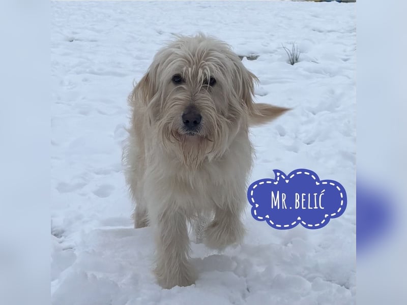 Mr. Belić (Passname: Beli) ist ein Rüde, laut Tierarztschätzung ca. 4 Jahre alt (geb. 04.09.2021), wiegt 25 kg und ist etwa 60 cm groß. Vermutet wird ein Barak / Retriever-Mischling.