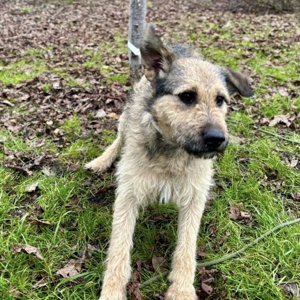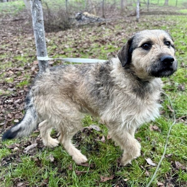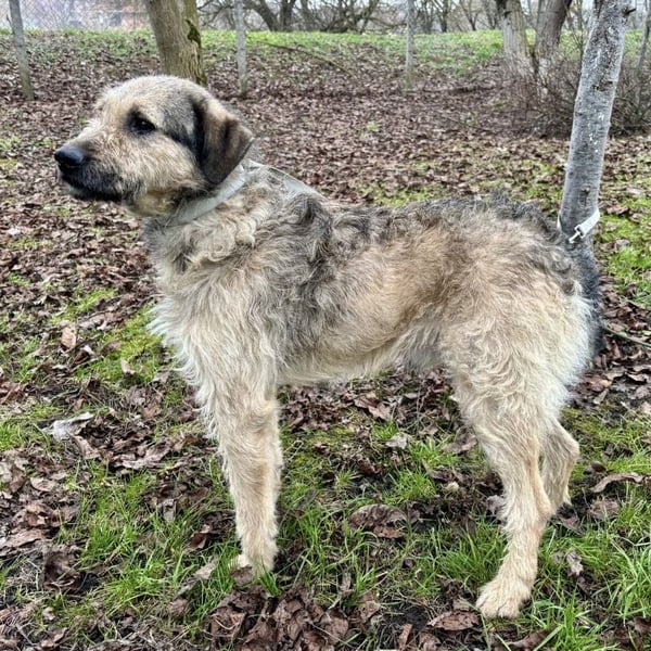 Ollie ist ein Bub, laut Tierarztschätzung ca. 3 Jahre alt (geb. 24.12.2022), wiegt 19 kg und ist 55 cm groß. Vermutet wird ein bosnischer Rauhaar-Laufhund bzw. Barak (Mischling).