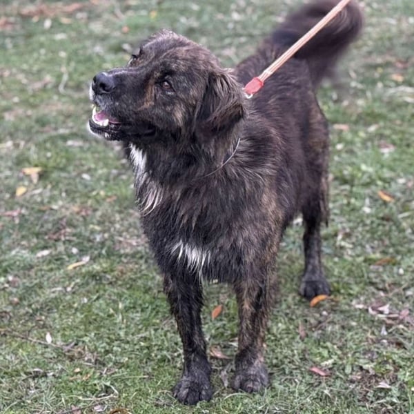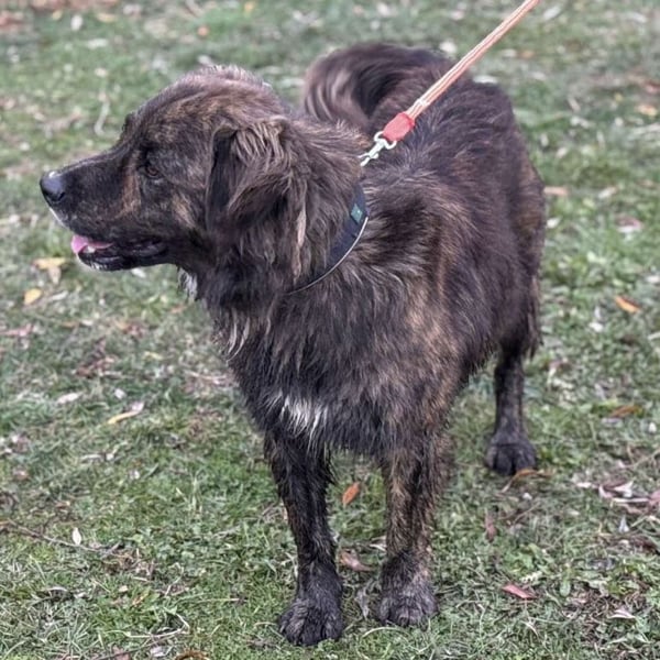 Teddy ist ein Rüde, laut Tierarztschätzung ca. 1 Jahr alt (geb. September 2024). Er ist etwa 62 cm groß und wiegt 28 kg. Vermutet wird ein Bardino-Retriever-Collie Mischling.