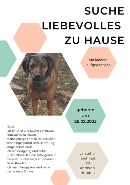 Arvi ist ein sportlicher, aufgeweckter und verschmuster Rüde. Er ist absolut stubenrein, fährt ruhig mit im Auto mit, ist mit Hunden und Katzen verträglich und kann nach einer fairen Eingewöhnungszeit auch ein paar Stunden alleine Zuhause bleiben. Mit seinen Lieblingsmenschen kuschelt er für sein Leben gern und ansonsten ist er ein absolutes "Dorfkind" - Streifzüge durch den Wald oder über die Wiesen mag Arvi sehr und Abende eingekuschelt vor dem Lagerfeuer sind einfach große Klasse für ihn. Arvi geht mit seinen Lieblingsmenschen durch dick und dünn und ist ein herzensguter und absolut loyaler Rüde, der es verdient hat, im eigenen Traumzuhause loszuleben!