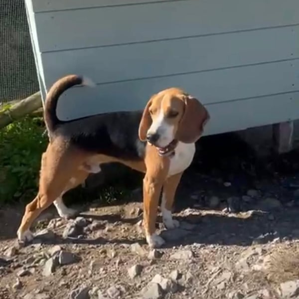 Sichtlich unruhig kam Florenzo (1,5 Jahre Stand Nov.`25) bei Brunella an und muss sich erst einmal orientieren. Die ersten Tage waren aufregend. Im Rudel zeigt sich der kastrierte Rüde verträglich, jedoch auch gestresst (was für die kurze Zeit ganz normal ist). Keiner weiß, was er vorher erlebt hat und was er kennengelernt hat. So viel kann man noch nicht über ihn aussagen. Florenzo ist ein schlanker Beaglerüde. Es hat mit Sicherheit auch mit dem Stress zu tun, dem er die ganze Zeit ausgesetzt war.