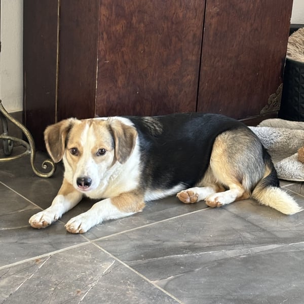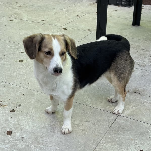 Nena ist eine Hündin, sie ist laut Tierarztschätzung ca. 2 Jahre alt (geb. 12.09.2023), wiegt 11-12 kg und ist etwa 35-40 cm groß. Vermutet wird ein Beagle-Mischling. Rosa farbige Schnauze - Pigmentstörung.