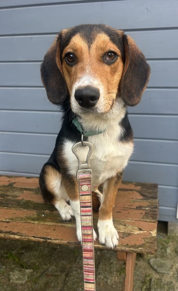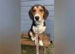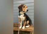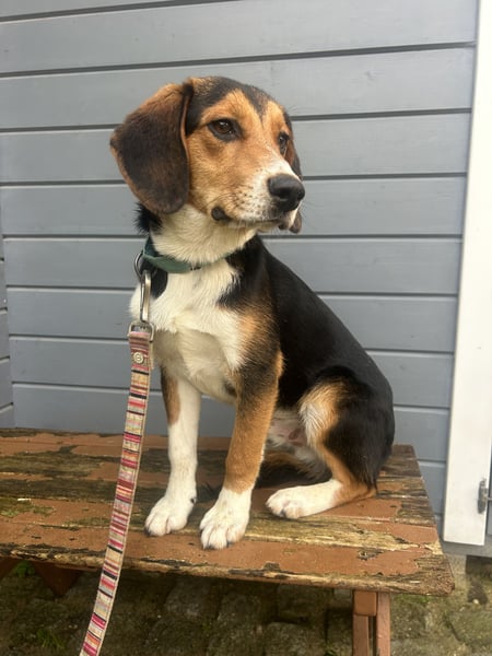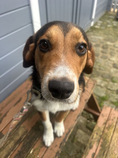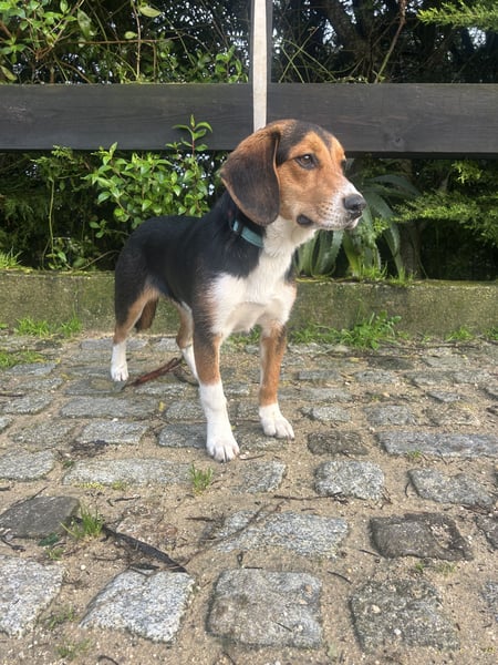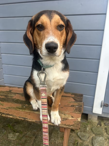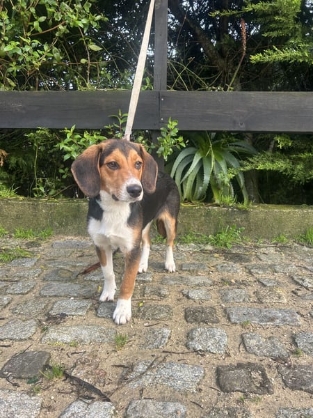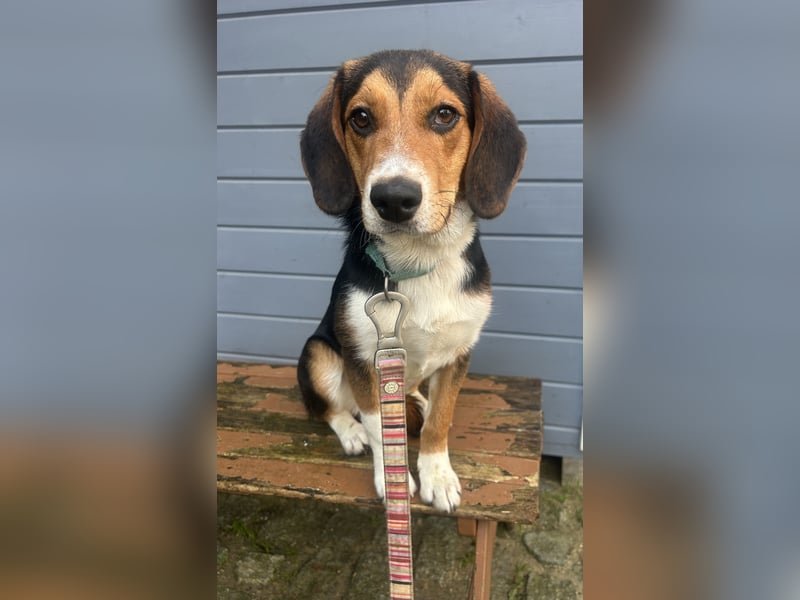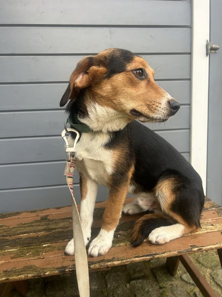Sein Erscheinungsbild lässt auf einen Jagdhund-Mix schließen. Jagdliche Motivation kann sich mit zunehmendem Alter noch entwickeln. Rückruf und Orientierung sollten von Beginn an sauber aufgebaut werden, damit er nicht lernt, zu sehr sein eigenes Ding zu machen – auch das gehört zu seiner Genetik.