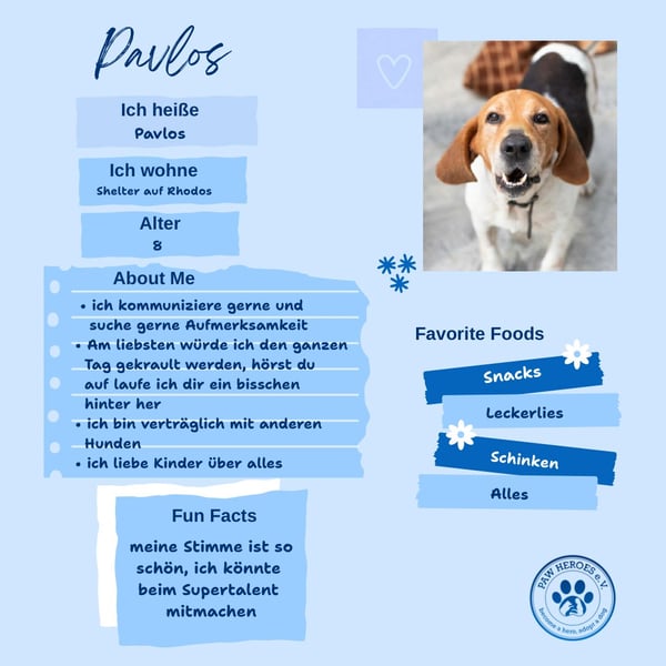 Wenn du Pavlos kennenlernen möchtest oder weitere Fragen hast, melde dich gerne. Wir suchen eine liebevolle Familie, die Pavlos die Stabilität, Liebe und das Kuschelplatzchen geben kann, das er verdient. Pavlos freut sich darauf, bald Einzug in sein neues Zuhause zu halten.