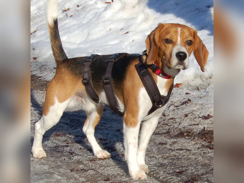 Archie Boy kommt aus Nürnberg und wird wegen der psychischen Erkrankung seines Herrchens abgegeben. Der hübsche Beagle-Rüde ist ein kleiner Lausbub und Herzensbrecher. Er bringt viel Lebensfreude mit und ist ein lustiger, goldiger Bursche, der für jeden Spaß zu haben ist. Anfangs zwar etwas zurückhaltend, taut er aber schnell auf und zeigt sich dann von seiner Beagle-typischen Art: verspielt, freundlich, voller Tatendrang. Wie es sich für sein Alter gehört, steckt er mitten in der Pubertät und muss noch einiges lernen. Mit Leckerlis lässt er sich toll motivieren und lernt schnell. Im Auto fährt der Herzbube brav mit und versteht sich mit den meisten Artgenossen. Aufgrund seiner rassetypischen jagdlichen Motivation sollten Kleintiere und Katzen nicht im neuen Zuhause leben. Die Leinenführigkeit muss noch geübt werden und auch das Alleinbleiben fällt ihm derzeit noch schwer. Er sucht Menschen, die ihn an die Pfote nehmen und ihm liebevoll, aber konsequent das Hunde-1×1 beibringen möchten.