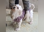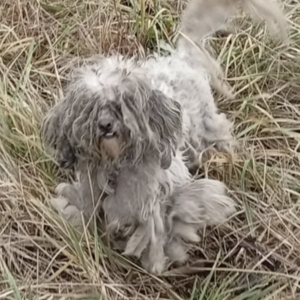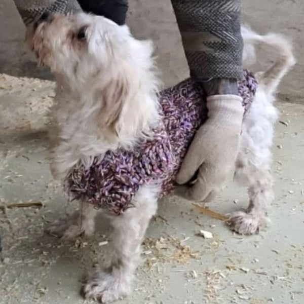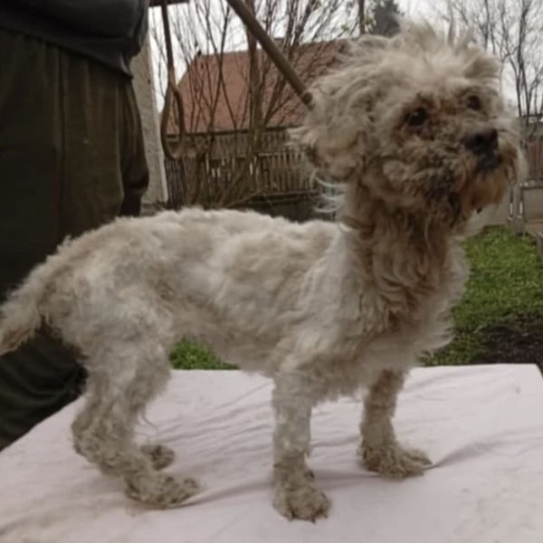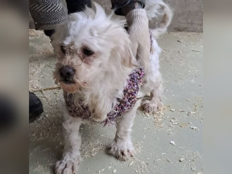 Die kleine Bichon-Mix Hündin Susse wurde in einem fürchterlichen Zustand zwischen zwei Dörfern gefunden.