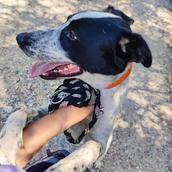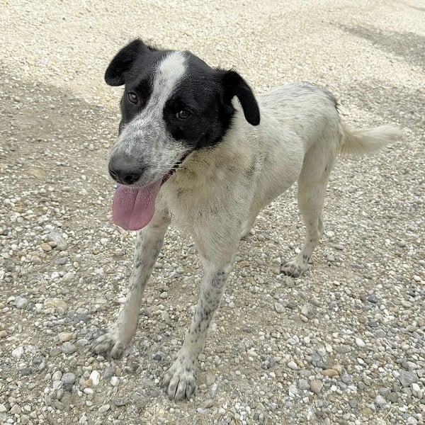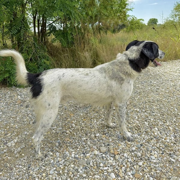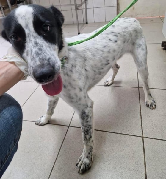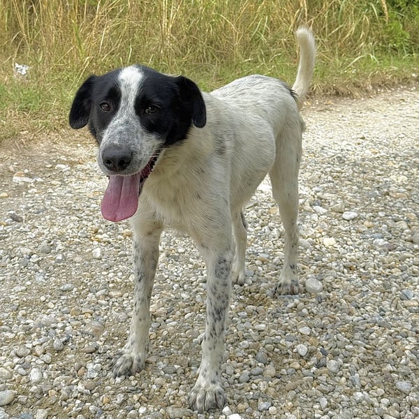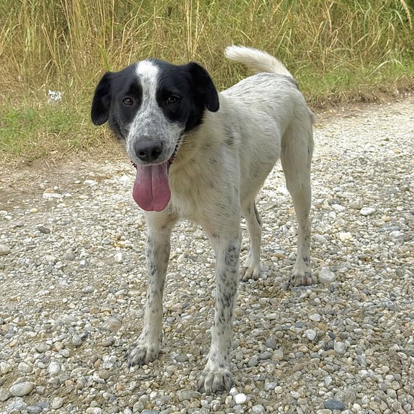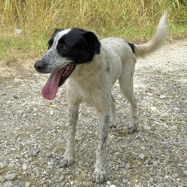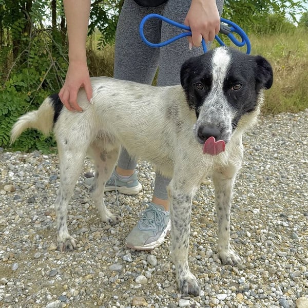 Falco, auch „Eus“ genannt, ist ein Bub, er ist laut Tierarztschätzung ca. 4 Jahre alt (geb. 10.08.2021), wiegt 25 kg und ist 66 cm groß. Mit seinem schwarz-weißen Fell, den Flecken und seiner besonderen Ausstrahlung ist er optisch ein echter Hingucker. Vermutet wird ein Border Collie mit Setter gemixt.