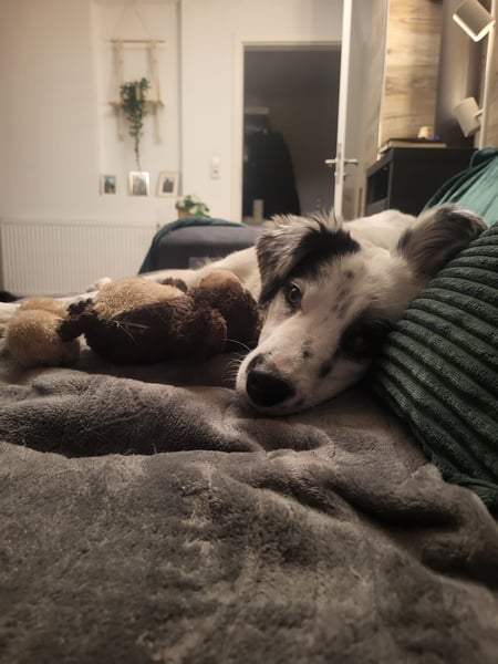 Sie läuft gut an der Leine, ist stubenrein und kann schon etwas alleine bleiben.