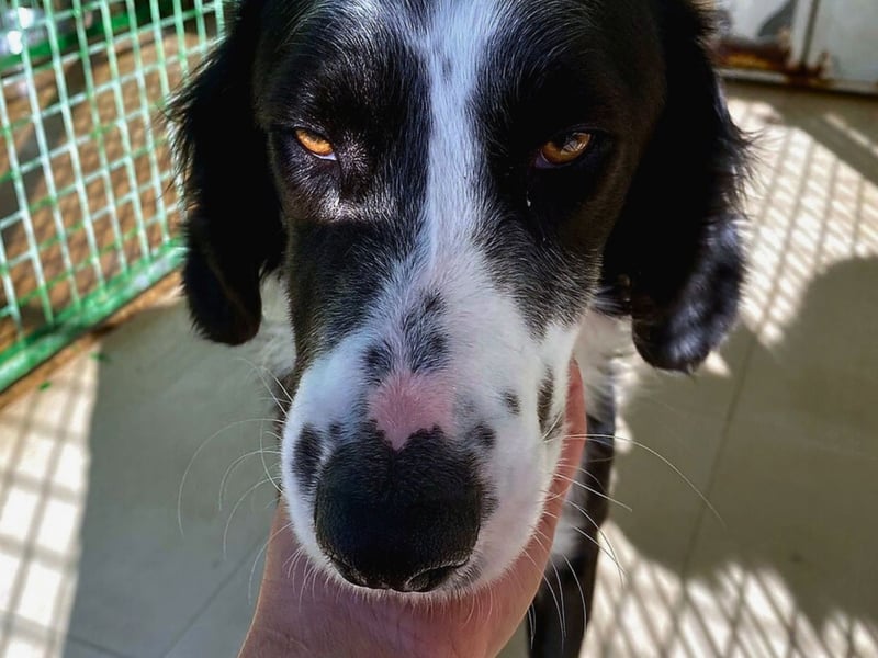 Carlo ist ein knapp einjähriger mittelgrosser Mischlingsrüde, in dessen Ahnenreihe Border Collies und Spinones gewesen sein könnten. Die ersten Tage verhielt er sich sehr zurückhaltend und scheu, doch nun taut er immer mehr auf. Die Gesellschaft der anderen Fellnasen im Gehege scheint ihm gutzutun, und er zeigt sich als sehr freundlicher Mitbewohner, der eine Spielaufforderung nicht unbeantwortet lässt, aber auch gerne für sich in den Tag träumt.