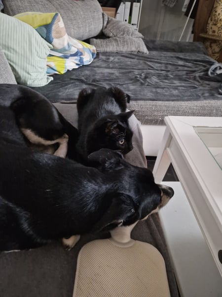 Ronny lebt mit meinem Kater und meiner älteren Hündin zusammen. Den Kater liebt er sehr. Die beiden sind vertraut miteinander, schmusen viel und gehen liebevoll miteinander um. Auch mit anderen Hunden ist Ronny sehr umgänglich, friedlich und verspielt.