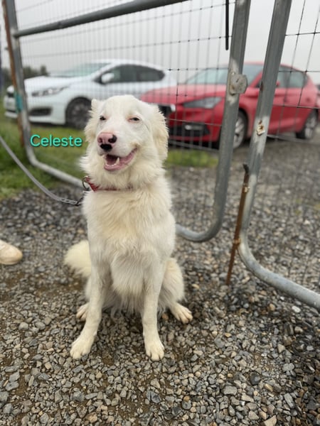 Celeste wurde in Spanien schwer verletzt gefunden, vermutlich angefahren. Er hatte einen gebrochenen Kiefer, gebrochene Rippen und starke Schwellungen. Wochenlang musste er einen medizinischen Maulkorb tragen. In seinem kurzen Leben hat er bereits sehr viel durchgemacht.