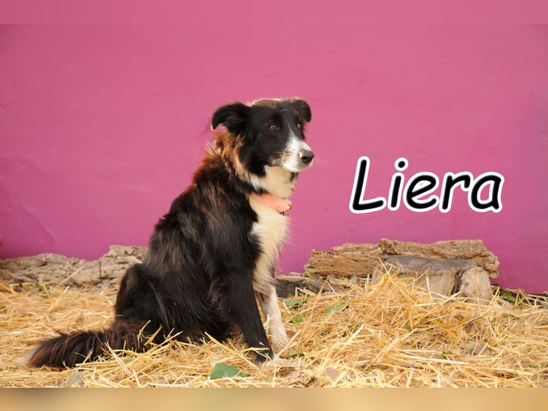 Liera ist eine wunderschöne Border-Collie-Hündin mit einem wachen Blick und einer ruhigen, feinen Ausstrahlung. In ihren Augen liegt diese besondere Mischung aus Neugier und Sensibilität, die so typisch für ihre Rasse ist. Man merkt sofort: In diesem zarten Hundekörper steckt ein kluger Kopf und ein großes Herz.