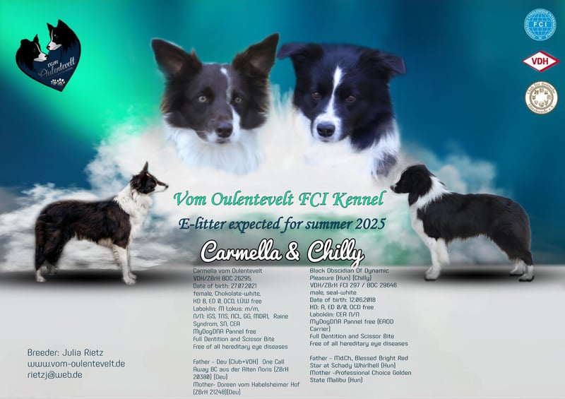 Zwei Rüden aus meinem aktuellen E*Wurf sind noch auf der Suche nach ihrem 5*Sternen Zuhause. Geboren am 17.06.2025, die Abgabe wäre ab 15.08.2025 möglich.